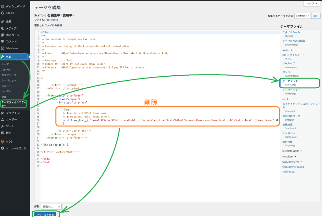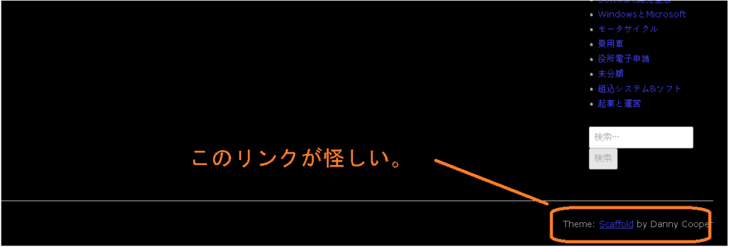 当方ブログでは、WordPress にて Scaffold というテーマを使用しています。フッター部にナゾのリンクがあり、不明な韓国語のサイトに飛ぶことがわかりました。 Scaffold 自体はわりと世間で広く使用さされているようで極めて怪しいものでは無いようです。作成者さんの広告リンクでしょうか?