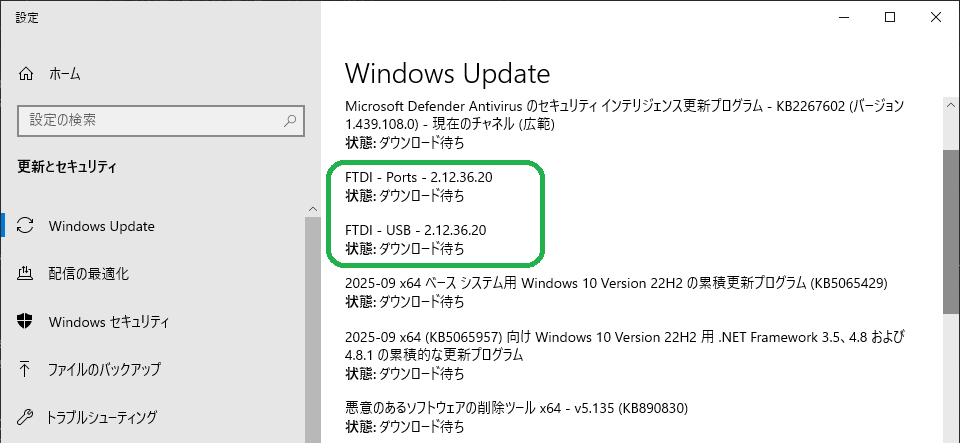 以下のように FTDI ドライバは Windows Update に含まれています。