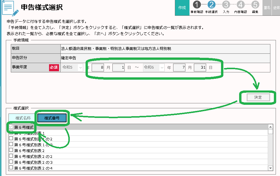 申告様式選択画面で決定をおすと様式選択が現れます。様式番号 を選択し一覧から「第六号様式」を選択し(プリセットで選択されています)、次へを選択。