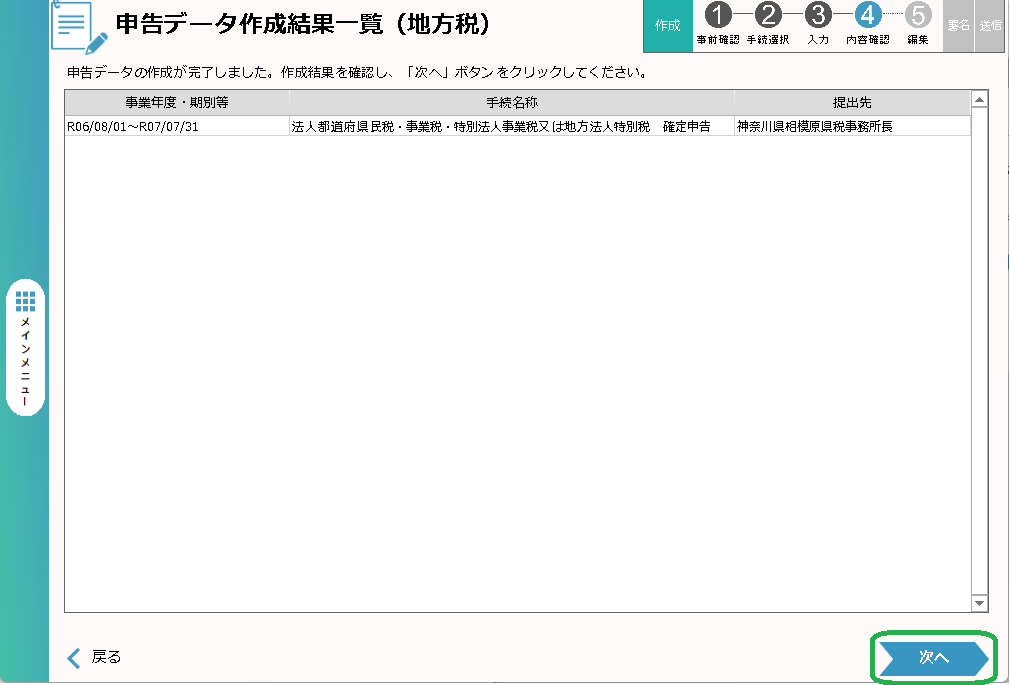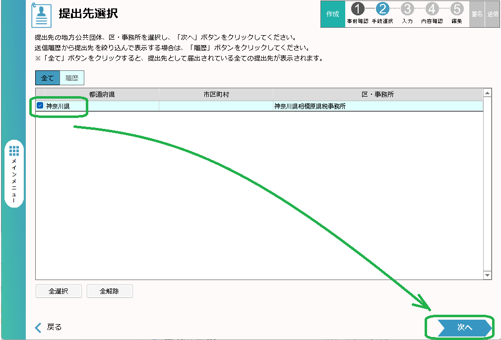 次に利用者情報確認画面から提出先の税務署を選択し、「法人都道府県民税・事業税」を選択します。