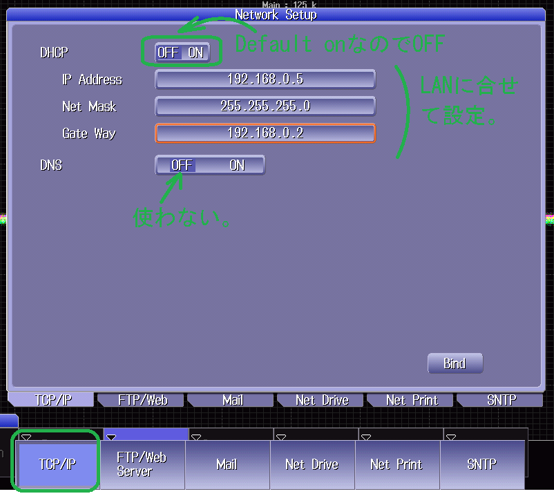 イーサがあるのでネットワークを設定します。本体でUtility -> NetWork -> TCP/IP から設定します。デフォルトはDHCPなので、OFFして固定IPを設定します。