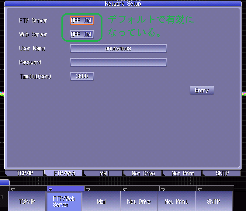 続いて波形画像を取り出すため FTP 設定を本体で行います。FTP は FFFTP を使用します。デフォルトで有効になっています。