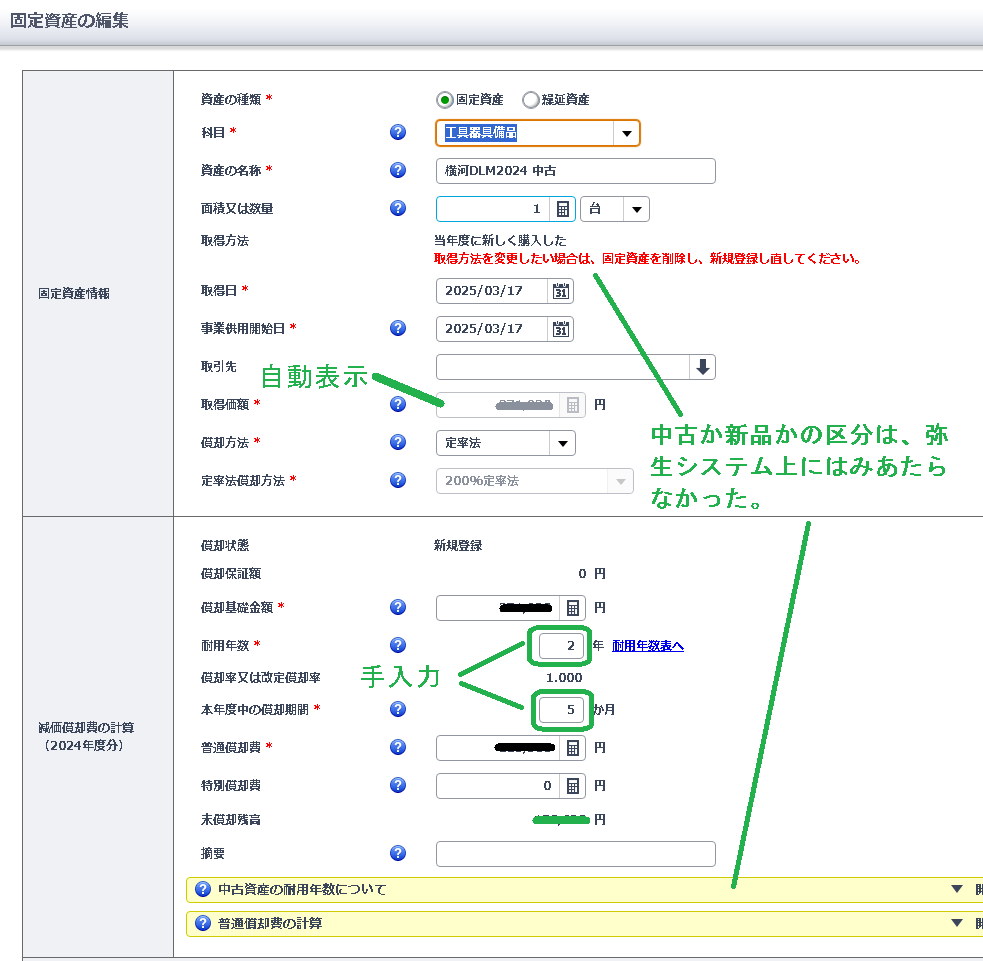 - 中古は「法定耐用年数の20パーセントに相当する年数」と耐用年数が異なるが、弥生上はその区分は持っていない。
