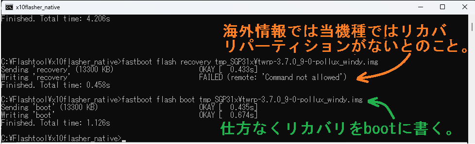 SGP312 ではリカバリ領域への書込みができませんでした。SGP311 でも同様でした。しかたなくboot領域にカスタムリカバリを書きます。SGP312 twrp-3.7.0_9-0-pollux_windy.img 同じでOK。