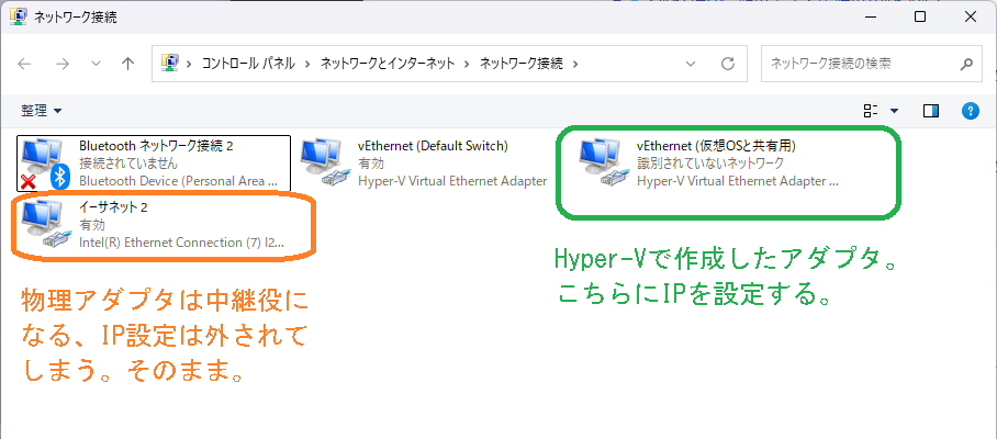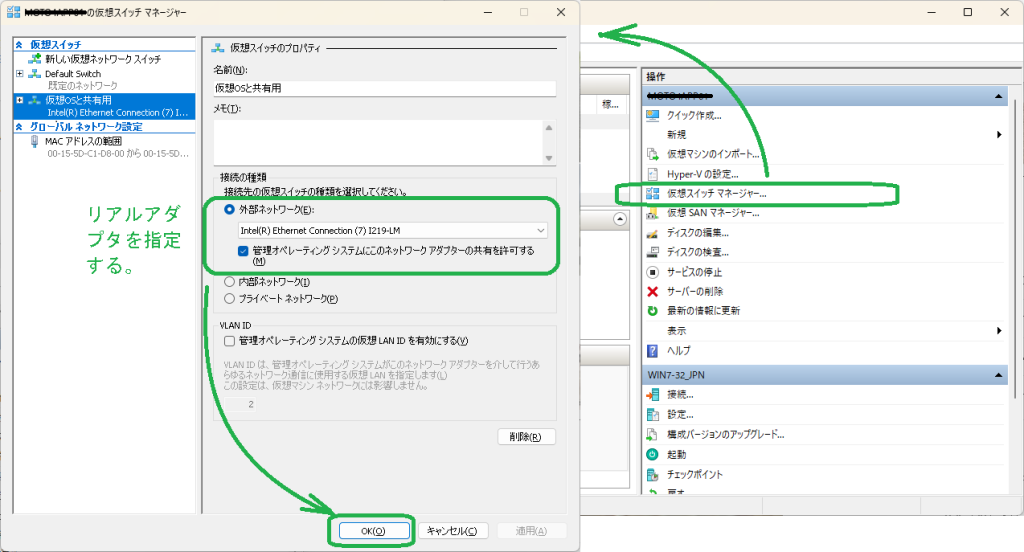 ホストOS側でリアルPCと仮想OSを一つのLANに入れるたのネットワークアダプタを、 Hyper-V の管理機能から以下のように作ます。この手順は、リアルネットワークアダプタを変更した場合も必要です。