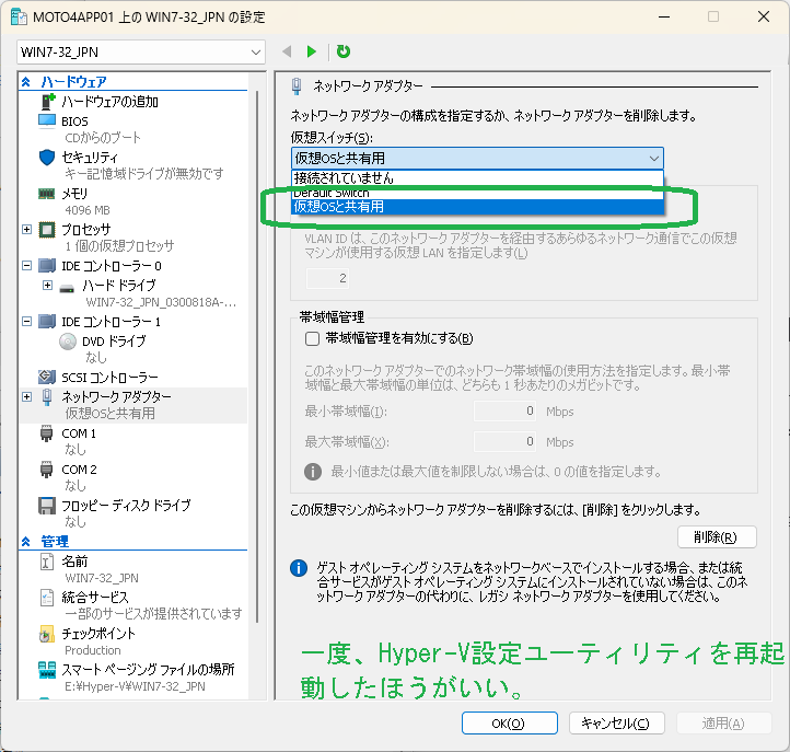 次に仮想OS側で、Hyper-V の管理機能の仮想OSの設定にて、ネットワークアダプタの仮想スイッチを作成したアダプタに切替えます。
