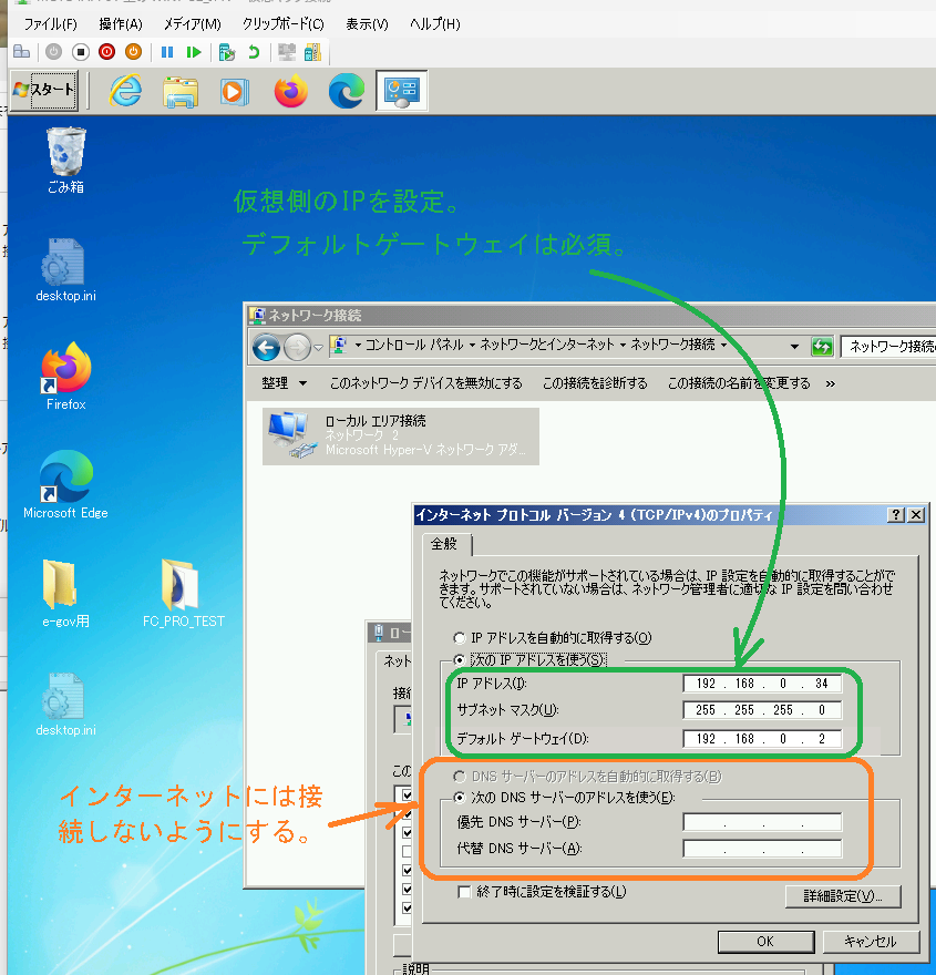 仮想OSを起動して、下記のようにTCP/IPの設定をします。古いOSはネットアクセスしないようにしておきます。