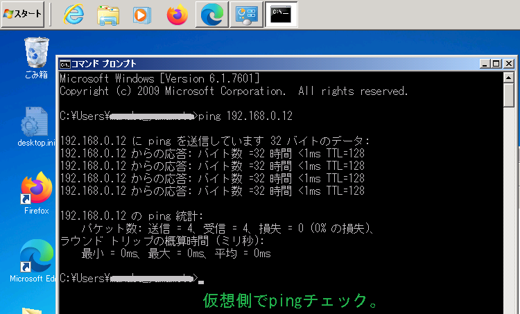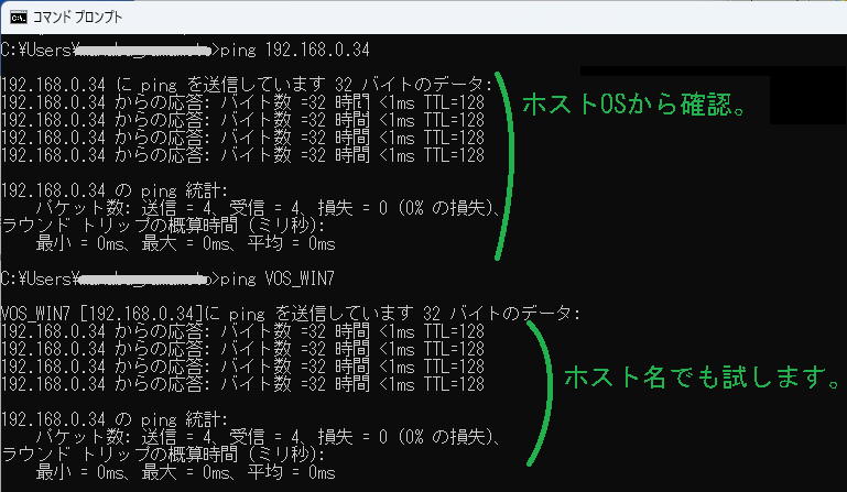 PingがホストOSに飛ぶか仮想OS側で確認します。