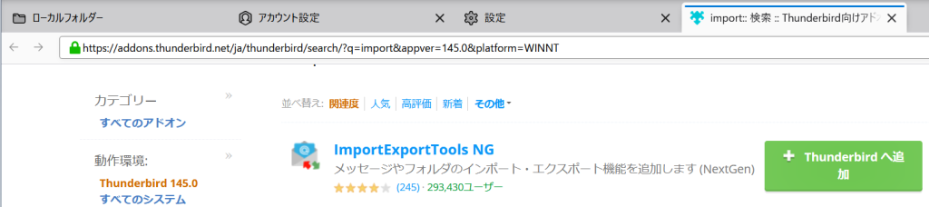 AI 曰く プラグイン ImportExportTools NG をインストールすると解決するとのこと。以下のようにThunderbirdからプラグイン検索して追加します。ネーミング末尾の「NG」が何を意味するのかちょっと気になります。