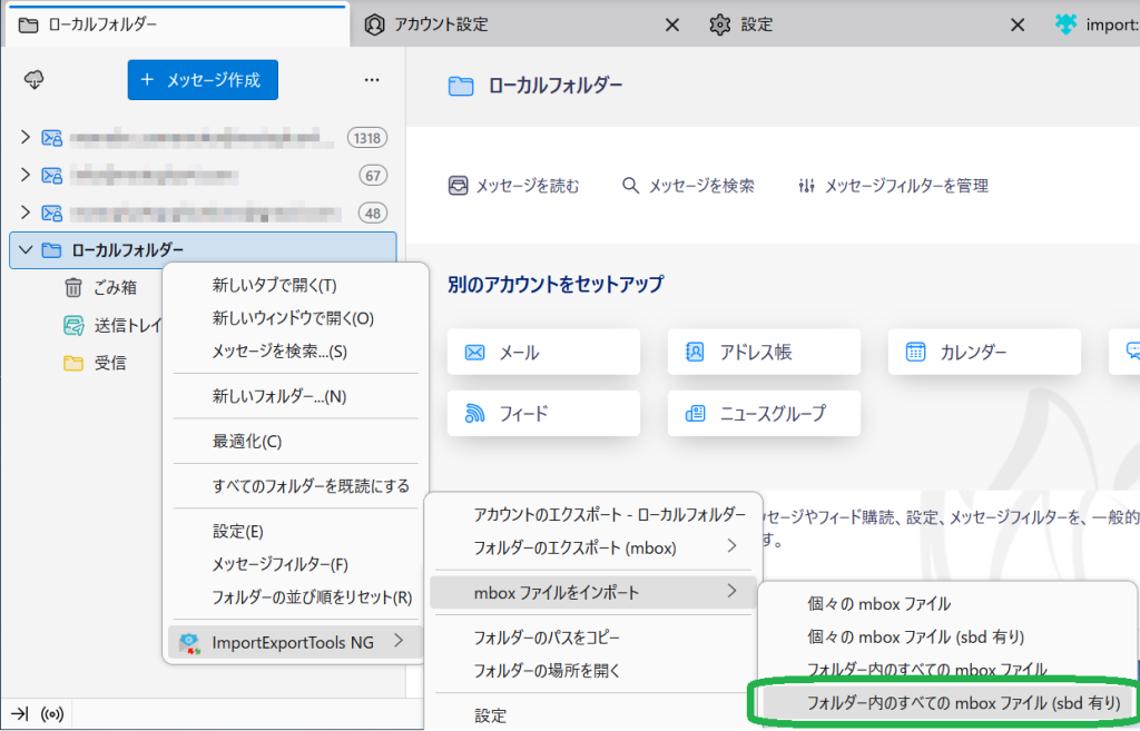 以下のようにImportします。メニュー階層が深いですね。.sbdフォルダ、.msf ファイルの置いてあるフォルダを指定します。