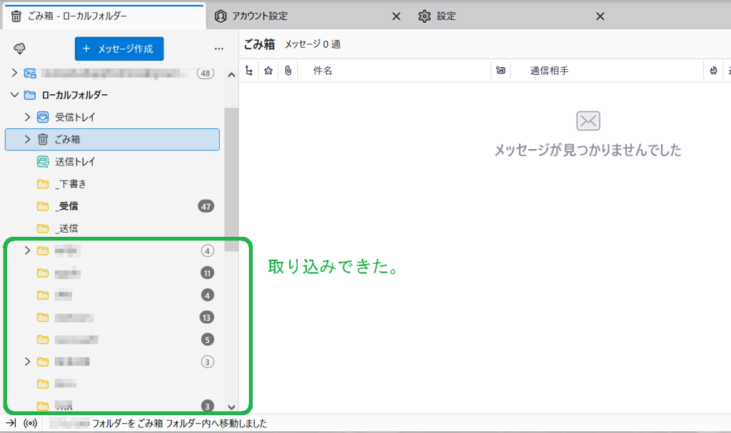 Import状況は、画面下部のステータスバーに表示されます。時間はそれなりにかかりましたが以下のようにImportできメール環境が回復しました。すばらしい。