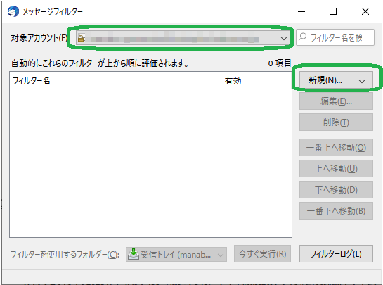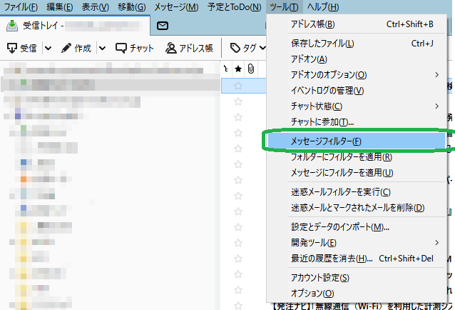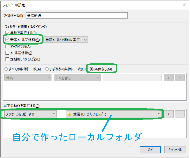 メッセージフィルターでローカルコピー設定をします。手順は以下のとおりです。設定はmailフォルダには残らず、PCを移行すると消えてしまいます。