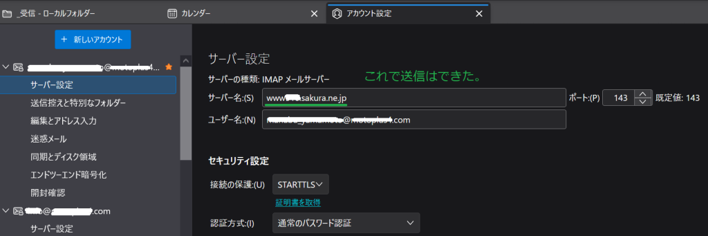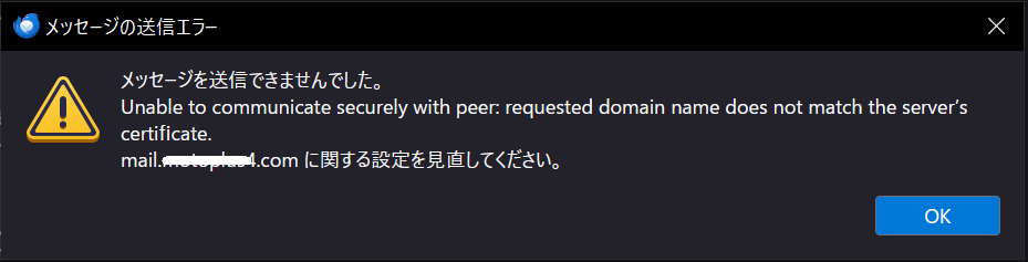 Thunderbirdをインストールし直したところ以下のエラーが発生するようになりました。メールサーバはさくらのサーバです。以前、gmailアカウントが使えない、Gmailアカウントへ送信エラーとなるなどの事象がありました。昔一度調べた気がしますが、また忘れそうなので覚書です。