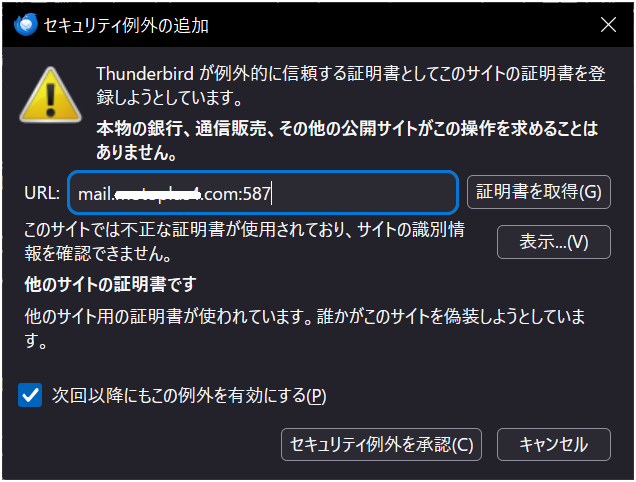 対応としては「次回以降もこの例外を有効にする」にチェックを入れ、「セキュリティ例外を承認」を押すと送信はできます。
