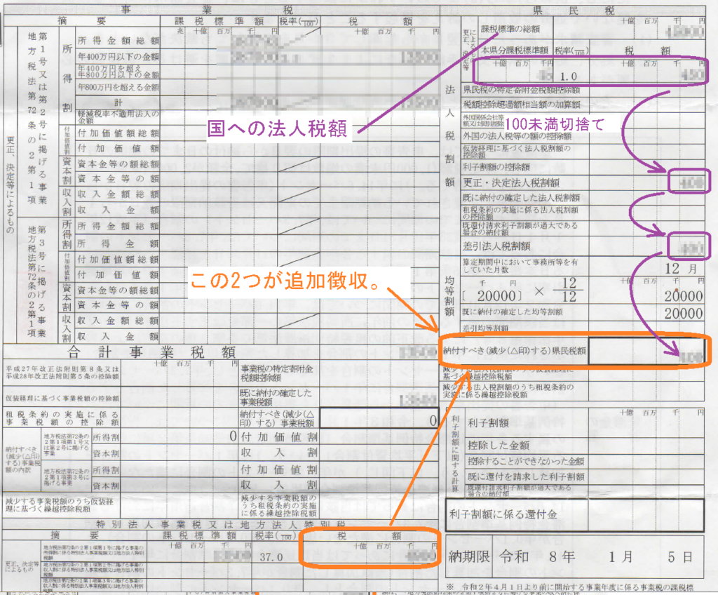 3か月前に法人税の確定申告をしましたが、県より法人税の請求が来ました。支払い用紙について来ており、それによると追加の支払いは以下の2点のようです。