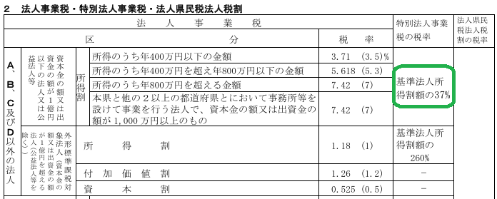| 特別法人事業税 = 課税標準 × 基準法人所得割額:37% の100円未満切捨て |