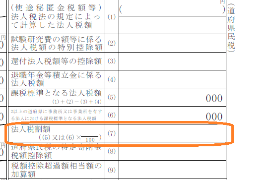 | 県民税法人税割 = 国への法人税額 × 法人県民税法人税割の税率: 要確認 の100円未満切捨て |