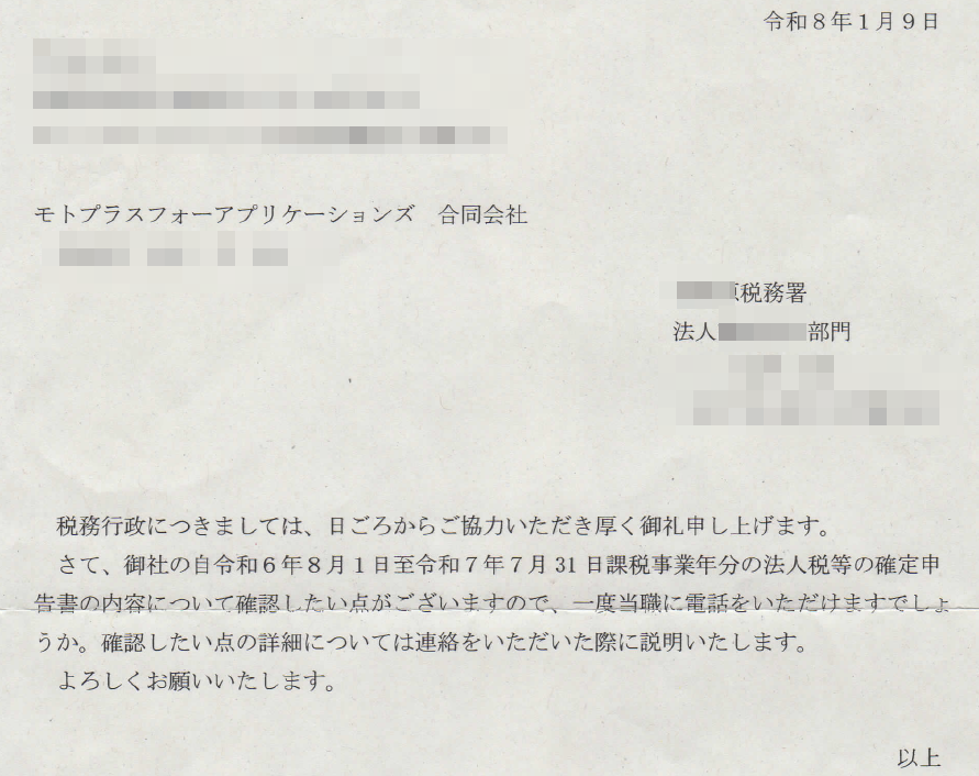 初めて黒字で法人確定申告を済ませて3か月後、税務署から呼び出しの手紙がきました。